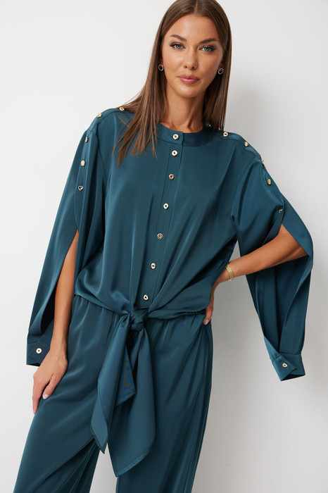 Блузка прямого силуэта с втачными фантазийными рукавами и разноуровневой линией низа. Блузка по переду предполагает завязку полочек и застегивается на петли пуговицы. Спинка блузки обработана резинкой по нижнему срезу. Горловина блузки обработана отрезной стойкой. Рукав с плечевым швом застегивается на декоративные пуговицы. По низу рукава расположена складка, рукав обработан притачной манжетой застегивающейся на петлю и пуговицу.
