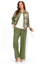 Костюм женский, состоящий из жакета и брюк. Жакет без подкладки, кроя «летучая мышь», с центральной однобортной застежкой на петли и пуговицы. По переду обработаны вертикальные прорезные карманы с листочкой. Спинка цельнокроеная, слева расположен декор в виде авторской броши. Горловина V-образной формы, обработана воротником пиджачного типа. Рукав 7/8, по низу обработан широкой притачной манжетой. Брюки женские, расширенные. По переду обработана застежка на молнию, обработаны карманы с наклонным входом. На задних половинках брюк застрочены вытачки. Верх обработан широким притачным поясом (частично на резинке), застегивающимся на петлю и пуговицу.