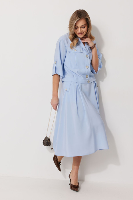 Костюм женский, состоящий из жакета и юбки. Жакет прямого силуэта без подкладки, длиной до линии бедра. По переду жакета настрочены накладные карманы с встречными складками. В шве притачивания кокетки расположен клапан кармана, застегивающийся на петлю и пуговицу. В среднем шве спинки расположена встречная складка. Рукав втачной одношовный, прямой. По низу рукава расположена пата, застегивающаяся на петлю и пуговицу. По низу жакета обработан отрезной пояс. Горловина обработана втачным воротником с лацканами. Застежка центральная , однобортная на петли пуговицы. Юбка женская на подкладке  А – силуэта длиной до середины икры. По переду юбки заложены встречные складки и нстрочены клапаны  с декоративными пуговицами. Спинка юбки цельная. Карманы обработаны в боковом шве юбки. По левому боковому шву юбки находится застежка – молния.  Верхний срез юбки обработан притачным поясом с резинкой по спинке.