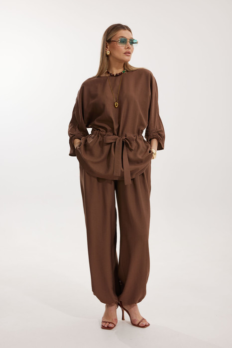 Брюки прямого силуэта с поясом на резинке. По передним половинкам заложены складки и обработаны наклонные карманы с отрезным бочком По низу брюки собраны на резинку. Верхний срез брюк обработан отрезным поясом на частичной резинке.
