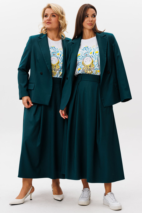 Удлинённая юбка дополняет ансамбль утончённым силуэтом. Модель с глубокими встречными складками визуально удлиняет ноги, а карманы, в боковых швах, сохраняют чистоту линий. Потайная молния по спинке обеспечивает комфорт и аккуратность, делая юбку универсальной для офиса, вечерних выходов или торжественных мероприятий.