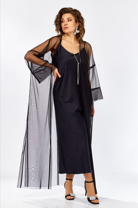 Изысканный комплект сочетает в себе платье из плотного атласа, свободного А образного силуэта , на Тонких бретелях и воздушную кардиган-шазюбль  из сетки создавая образ утончённой элегантности   женственности
