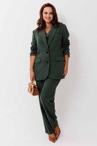 Уникальный и в тоже время очень красивый дизайнерский костюм. Блузон из хлопкового шитья свободного силуэта, воротник рубашечного типа на стойке. Вырез декоративная планка на пуговицах, рукав втачной со сборкой на фигурной манжете. Низ на планке с легкой сборкой. Блузка будет прекрасно смотреться в комплекте с брюками, а так же с юбкой, каждый раз помогая Вам создавать новый неповторимый образ. Брюки расширенные от бедра, свободного силуэта с завышенной талией ( высокой посадкой ) из легкой костюмной ткани "Лён-вишер", в которых вы будете чувствовать себя комфортно, пояс с эластичной лентой по спинке.