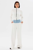 Комплект из костюмной ткани в полоску,состоящий из жилета и бермуд.Жилет женский, полуприлегающего силуэта,  на подкладке, длиной ниже линии бедер, с центральной сквозной двубортной застежкой на 2 петли и 2 пуговицы, 2 декоративные пуговицы, и 1 потайную петлю и пуговицу. Детали переда жилета с отрезными бочками, центральные части с нагрудными вытачками, с прорезными горизонтальными карманами с клапанами. Деталь спинки жилета с рельефными швами и плечевыми вытачками, со средним швом, который заканчивается шлицей. Вырез горловины жилета «V-образной формы». Жилет с притачной понизу подкладкой.     Бермуды прямые к низу, с притачным поясом, по боковым частям пояса вставлена эластичная тесьма. Застежка на тесьму-молнию и 1 петлю и пуговицу. На передних половинках обработаны по 1 складке, в боковых швах – наклонные карманы. На задних половинках обработаны по 1 вытачке на каждой половинке. На передних и задних половинках заутюжены «канты». На поясе прикреплены 5 шлёвок.                          Жилет: длина плеча - 17см, длина спинки – 70см.