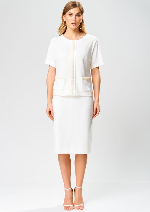 Комплект женский (джемпер и юбка) из трикотажного полотна.  Джемпер женский, полуприлегающего силуэта,  длиной до линии бедер, с втачными рукавами. Деталь переда джемпера с нагрудными вытачками, по центру втачная планка, на которой настрочена декоративная тесьма. С двумя накладными карманами фигурной формы, по верху карманов расположена декоративная тесьма. Рукава втачные одношовные, короткие. Вырез горловины округлой формы, обработан обтачкой.