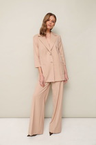 Комбинезон женский из вискозной ткани, свободного силуэта, на бретелях, с застежкой на потайную тесьму-молнию в среднем шве спинки, в боковых швах обработаны карманы. Детали переда комбинезона с нагрудными вытачками. Бретели декорированы съемными поясками, с застежкой на петли и пуговицы. На уровне линии талии на спинке и по переду комбинезона прикреплены по 2 пуговицы – для съемных поясков. Вырез горловины комбинезона «V-образной» формы.Джемпер из льносодержащего трикотажа: длина рукава (с манжетой) – 52см, ширина рукава – 24см, длина спинки – 37см.Комбинезон: длина спинки – 137см.