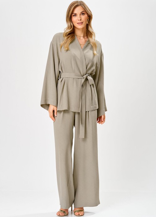 Жакет женский из мягкой костюмно-плательной ткани с креш-эффектом, свободного силуэта, длиной ниже линии бедер, со спущенной линией плеча, с втачными рукавами, в боковых швах обработаны разрезы, со съемным поясом. Детали переда жакета с отрезными бочками. Деталь спинки жакета с втачной стойкой, переходящей на перед. Рукава втачные одношовные, широкие. По боковым швам на уровне линии талии прикреплены шлевки для протяжки съемного пояса.