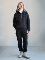 Блузон полуприлегающего силуэта с разрезами по боковым швам (по 7 см). На передней части изделия горизонтальные вытачки. В среднем шве спинки потайная застежка-молния. Горловина обработана стойкой-воронкой, высотой 4,5 см. Длина блузона по спинке от стойки 55 см. Рукав-втачной, одношовный, чуть расклешен к низу. Спереди рукава заложена открытая шлица, высотой 15,5 см, на которой  расположены  в качестве декора нефункциональные пуговицы. Длина рукава 41 см.