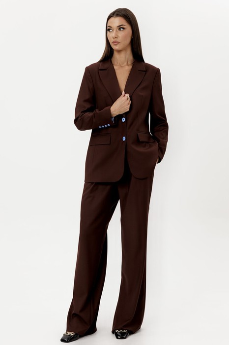 Стильный гармоничный комплект в стиле умеренного оверсайза, состоящий из свободного жакета и широких брюк. Эффектной деталью комплекта выступает высокая открытая шлица на спинке жакета, закрепленная пуговицами.
