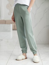 Брюки комплекта созданы в свободном стиле. В пояс брюк по спинке вставлена эластичная тесьма, шириной 3 см. Спереди пояс фиксируется горизонтально на петли/пуговицы и вертикалную закрытую клапан-молнию (гульфик). При желании в пояс можно вставить ремень, так как имеются шлевочные держатели. В боковых швах карманы с наклонным входом, на поясной линии талии переда расположена неглубокая складка для свободы движения, на задних полотнищах линии талии: вытачки. Длина брюк по боковому шву 108 см (без учета высоты пояса).