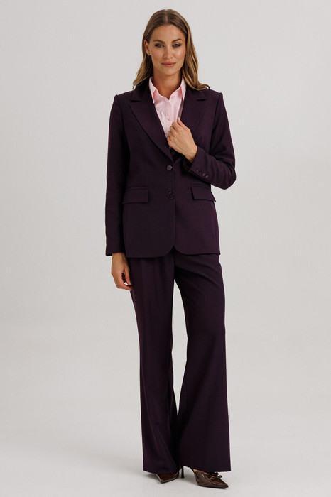 Стильный гармоничный комплект в стиле умеренного оверсайза, состоящий из свободного жакета и широких брюк. Эффектной деталью комплекта выступает высокая открытая шлица на спинке жакета, закрепленная пуговицами.