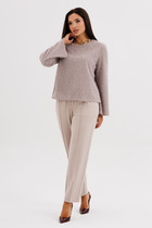 Брюки комплекта созданы в свободном стиле. В пояс брюк по спинке вставлена эластичная тесьма, шириной 3 см. Спереди пояс фиксируется горизонтально на петли/пуговицы и вертикалную закрытую клапан-молнию (гульфик).