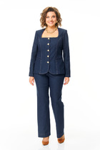 Брюки комплекта созданы в свободном стиле. Силуэт брюк к низу изделия имеет расклешение. В пояс брюк по спинке вставлена эластичная тесьма, шириной 3 см. Спереди пояс фиксируется горизонтально на петли/пуговицы и вертикальную закрытую клапан-молнию (гульфик). При желании в пояс можно вставить ремень, так как имеются шлевочные держатели. В боковых швах: карманы с наклонным входом, на поясной линии талии переда расположена неглубокая складка для свободы движения, на задних полотнищах линии талии-вытачки. Длина брюк по боковому шву 108 см (без учета высоты пояса).