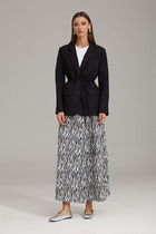 Платье комплекта создано из трикотажного полотна прямого силуэта. В боковых швах изделия расположены внутренние карманы и открытые разрезы-шлицы высотой 30 см. На передней части платья расположены горизонтальные выточки. Горловина платья оформлена V-образным вырезом с заходящими планками и отложным воротником. Глубина выреза 13-14 см. Ширина планок 3 см. Рукав прямой, одношовный, втачной. Длина рукава 59-60 см. Длина изделия по спинке 124-126 см (в зависимости от размерного ряда).