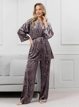 Брюки комплекта созданы в свободном стиле из джинсовой ткани. Силуэт брюк к низу изделия имеет расклешение. В пояс брюк по спинке вставлена эластичная тесьма, шириной 3 см. Спереди пояс фиксируется горизонтально на петли/пуговицы и вертикальную закрытую клапан-молнию (гульфик). При желании в пояс можно вставить ремень, так как имеются шлевочные держатели. В боковых швах: карманы с наклонным входом, на поясной линии талии переда расположена неглубокая складка для свободы движения, на задних полотнищах линии талии: вытачки, также на задних полотнищах расположены накладные карманы. Длина брюк по боковому шву 108 см (без учета высоты пояса). По основным линиям изделия проложена декоративная строчка контрастного охрового тона.