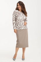 Юбка комплекта из эффектного трикотажного полотна на основе велюра с пайетками в стиле «карандаш» на подкладке, чуть зауженная к низу. В среднем шве расположены потайная молния и открытый разрез, высотой 32 см. На линии талии расположены классические вытачки, пояс внутренний, обтачной. Длина изделия по среднему 82-83 см.