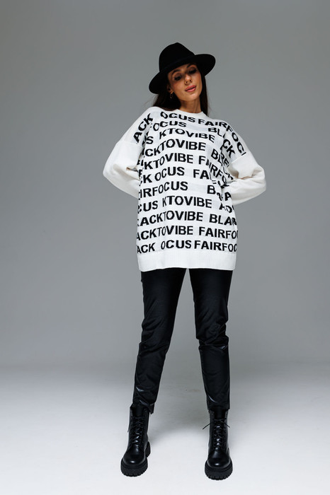 Гармоничный комплект, состоящий из уютного свитера и облегающих брюк из эко- кожи.