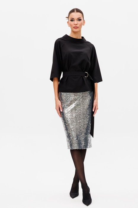 Блузон прилегающего силуэта с разрезами по боковым швам (по 7 см). На передней части изделия горизонтальные вытачки. В среднем шве спинки потайная застежка - молния. Горловина обработана стойкой-воронкой, высотой 4.5 см. Длина блузона по спинке от стойки-54 см. Рукав-реглан, чуть расклешен к низу. Длина рукава от горловины-стойки 46 см.