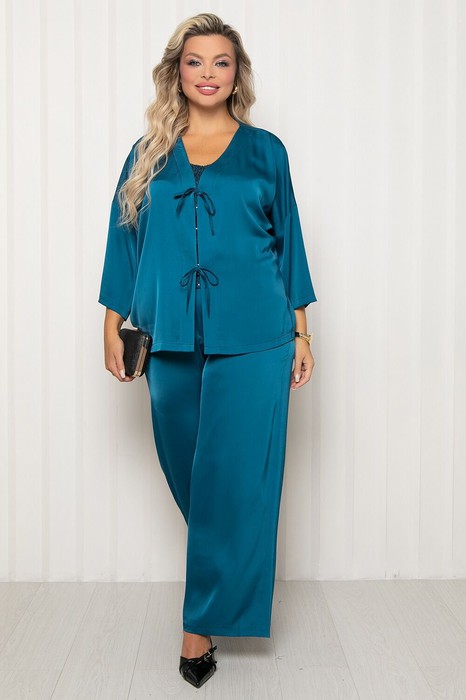 Брючный костюм двойка, состоящий из блузки и брюк из шелка.