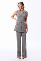 Комплект состоящий из жилета и укороченных брюк (кюлоты) Жилет на подкладке, прямого силуэта с увеличенной плечевой накладкой.  Застежка двубортная на 2 петли и пуговицы. В комплект входит мягкий пояс из основной ткани. Брюки прямого покроя на  прямом поясе с резинкой по спинке. Застежка на тесьму-молнию и пуговицу. По передним половинкам брюк функциональные карманы.