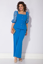 Сногсшибательный нарядный костюм. Модель состоит из романтической блузки с квадратным вырезом горловины. Изделие с застежкой на планке на петли и пуговицы. Рукав – фанарик, выполнен из хлопкового ришелье с  присборенным на резинку низом. Брюки свободного фасона (палацо). Модель на притачном поясе с заложенными складками и боковыми карманами.  По спинке в поясе предусмотрена резинка. В комплекте идет съёмный пояс с декоративной пряжкой! ХИТ продаж весна-лето– 2023!!!
