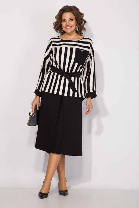 М 1386 50 52 54 56 фото Костюм: блузон=брюки Пэ-90, вискоза – 8, спандекс – 2 см. Оригинальный брючный комплект, состоящий из блузона и юбки-брюк. Модель блузона выполнена из креп-шифона в продольную полоску. Вырез горловины округлый. Рукав на спущенном плечевом поясе, с манжетом по низу рукава. Спнка выполнен из однотонной ткни, по бокам есть разрезы. По лифу расположен декоративный карман со съемной брошью. Талию можно подчеркнуть съемным поясом из основной ткани. В костюм входит брюки-юбка из поливискозы с боковыми карманами. Пояс притачной на круговой резинке.