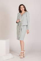 Комплект выполнен из хлопкового джинса. Куртка прямого силуэта, со спущенной линией плеча. Спереди центральная застежка на петли и пуговицы, по передним половинкам накладные карманы. Воротник стояче отложной. Низ рукава на притачной манжете, с застёжкой на петлю и пуговицу. По низу куртки вставлен шнур. Куртка без подкладки. Брюки на притачном поясе, на резинке, заужены к низу. Застежка брюк спереди по типу «гульфик». По бокам карманы с наклонным входом. Сзади накладные карманы.