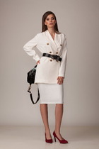 Жакет прямого силуэта, укороченный, на подкладке. Горловина - круглая, нагрудная выточка от бокового шва. Карман функциональный, прорезной с листочкой. Рукав втачной двухшовный. Отделка горловины, края борта и листочки из отделочной ткани. Застежка на петли-пуговыцы.