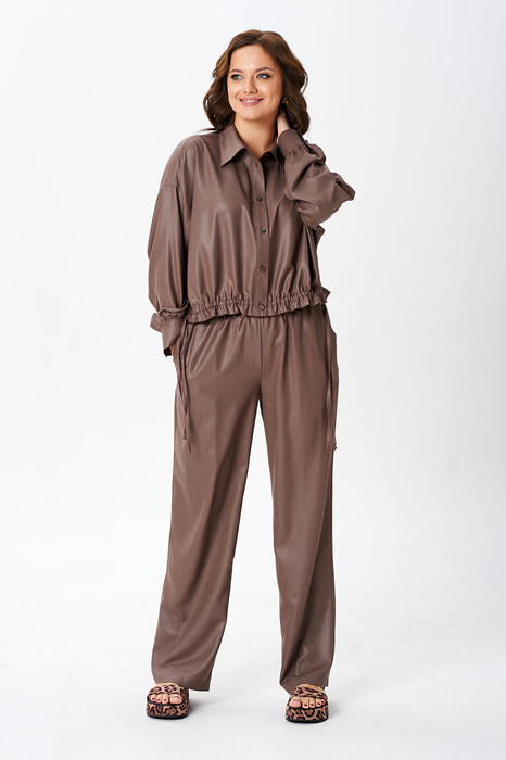 Блузка свободного кроя со спущенной линией плеча. Воротник рубашечного типа на отрезной стойке, центральная застёжка на петли и пуговицы. Низ блузки по спинке и переду собирается на кулису, которая может регулироваться по ширине. Рукав втачной, низ обработан притачной манжетой с застежкой на петлю и пуговицу. Брюки свободного кроя, на притачном поясе с эластичной тесьмой и потайным шнуром из основной ткани. В боковых швах карманы “ хулиганы”.