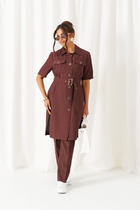 Жакет выполнен из костюмной ткани. Жакет Х-образного силуэта, длиной чуть ниже линии бёдер. Спереди центральная застежка на петли и пуговицы. По переду и спинке в области талии заложены складки. Спинка со средним швом. Воротник - цельнокроеная стойка. Рукав втачной двух шовный. Жакет на подкладке. Брюки прямого кроя. На передних половинках небольшая складка, переходящая в стрелку. Верхний срез брюк обработан притачным поясом, по бокам вставлена резинка, имеются шлёвки под ремень. Застёжка брюк по типу «гульфик». В боковых швах карманы «хулиганы». На задних половинках брюк вытачки.