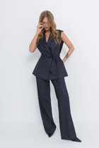 Прямые удлиненные брюки, расширенные к низу от колена главный тренд этого сезона. Брюки средней посадки с косыми карманами и отрезным поясом , в размерах 50-52-54 по бокам на резинке. Застежка обработана по классической технологии (гульфик с молнией и пуговица на поясе). Вся обработка выполнена как в классических итальянских костюмах. Жакет и жилет на подкладке.