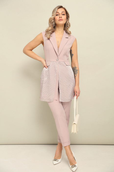 Костюм 2ка, состоящий из жилета и брюк. Удлиненный приталеный жилет с отложным вортником и лацканами. Застёжка центральная на пуговицу и петлю. По бокам выполнена имитация карманов с калапанами. Нижняя часть жилета состоит из двух слоёв: верхний -из лёгкой шифоновой ткани со стразами, нижний- из основной ткани . Длина по спинке 83-85 см. Брюки свободного прилегания по бедрам и зауженные к низу. Пояс на эластичной тесьме с кулисой и втянутым шнурком. Вход в карман фигурный, наклонный к боковому шву.