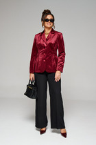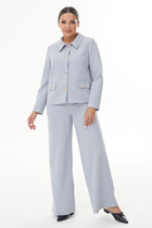 Комплект 2ка, состоящий из блузки и брюк. Блуза из тонкой ткани с атласным эффектом, свободного силуэта с V-образным вырезом. Это довольно глубокий вырез, который прекрасно подчёркивает декольте и линию шеи. Застежка на навесные петли и пуговицы. Рукава длинные объёмные втачные заканчиваются широкой манжетой с застёжкой на навесные петли с пуговицами. Брюки малого объема, прямого силуэта. На передних половинках с обеих сторон расположены под наклоном нефункциональные прорезные карманы в рамку. На задних половинках расположены вытачки. Пояс отрезной. На поясе расположены шлевки. Застежка брюк – гульфик на молнии, на поясе крючок. Длина блузки 67 см, длина брюк 110-112 см.