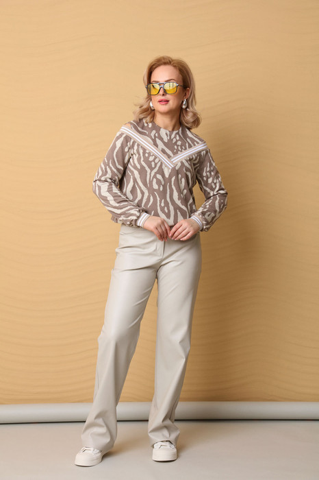 Комплект 2ка, состоящий из джемпера и брюк. Джемпер свободного объёма, оригинального кроя, с имитацией топа и открытыми плечами. Горловина круглая, по спинке застежка на петлю и пуговицу Отделка горловины джемпера и манжеты выполнены из довязов в контрастном цвете. Прямые брюки из мягкой экокожи с вискозной мягкой изнанкой, очень приятной к телу. По переду и сзади расположены карманы по принципу джинсовых брюк. Застёжка на молнию и пуговицу. Рост модели 170, размер 48.                СОВЕТ ОТ СТИЛИСТА:  из обуви отлично подойдут лоферы на высокой платформе и небольшая сумка , держащая форму. Для образа "выходного дня" сделайте выбор в пользу кроссовок или кед.