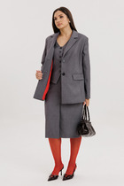 Комплект, состоящий из куртки и платья. Платье прямого силуэта , свободного объема, со спущенной линией плеча. По бокам платья расположены карманы.По низу переда и спинки разрезы. Также, низ платья по бокам можно регулировать по длине за счет шнуровки и регуляторов. На перед платья настрочены молнии, на которые застегивается съемная куртка. Куртка длинной до талии .По переду расположены клапаны, воротник-стойка. Куртка съемная, ее можно надеть отдельно от платья. Рост модели 170, размер 48.