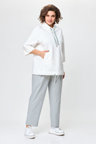 Костюм брючный состоит из блузы и брюк. Блуза из натуральной вискозы на хлопковой подкладке. Блуза без рукавов, воротник пиджачного типа, застёжка на петли и пуговицы. По всей линии талии резинка, низ блузы на сборке и обработан подкладкой. Брюки прямого силуэта, заутюженные на кант. По линии талии притачной пояс, застёжка на молнию и петлю-пуговицу. В боковых швах прорезные карманы.