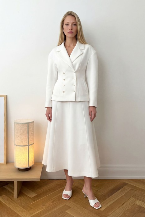 Комплект состоит из жакета и юбки. Жакет Х-силуэта. Линия плеча спущена и выдвинута, фиксируется на плечиках. Рукав длинный, зауженный к низу. Воротник пиджачного типа с отлетным воротником и лацканом. Застежка двубортная на петли и пуговицы, по переду идут вертикальные рельефы от плеча и до низа жакета, по бокам карманы и листочки. По спинке средний шов и вертикальные рельефы. Юбка А-силуэта на притачном поясе, на подкладке. По переду и спинке вертикальные рельефы. Застежка в боковом шве.