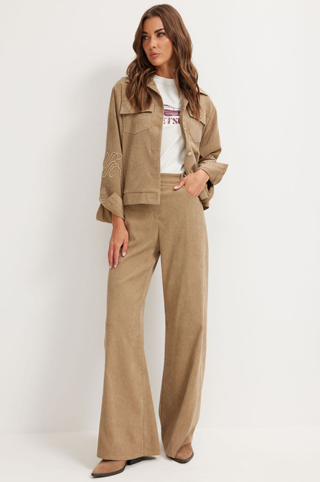 Брюки прямого силуэта расширенные книзу из костюмной ткани. По верху притачной пояс с застежкой на петлю и пуговицу и шлевками для ремня. На передних половинках обработаны карманы и застежка молния в среднем шве. На задних половинках кокетка и накладные карманы. На кармане дизайнерская вышивка. По поясу задних половинок брюк резинка. Обращаем ваше внимание, что фурнитура может отличаться от фото.