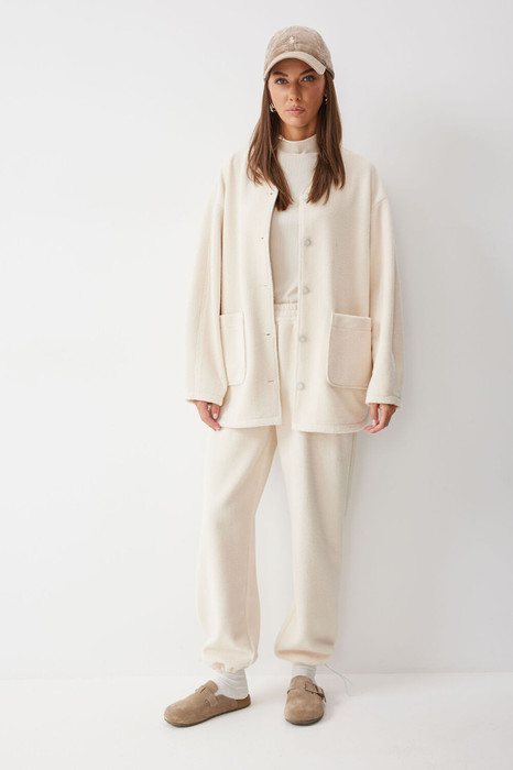 Костюм, состоящий из жакета и брюк. Жакет прямого силуэта с фигурным низом из трикотажного полотна. Горловина округлая, по центру застежка на кнопки. Рукав со спущенной линией плеча. По переду накладные карманы. Жакет без подкладки. Обращаем ваше внимание, что фурнитура может отличаться от фото.
