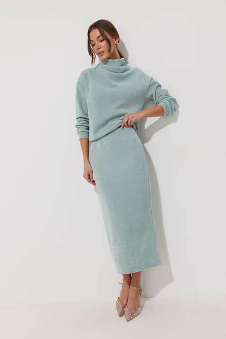 Юбка из трикотажного полотна, длина миди. Прямого силуэта. По верхнему срезу резинка. По среднему шву заднего полотнища разрез. Юбка на трикотажной подкладке.