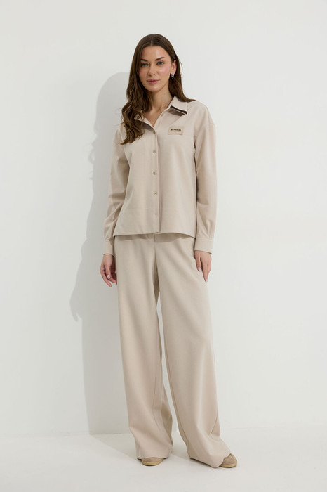 Брюки из гладкого трикотажного полотна, прямые, свободного, расширенного силуэта. Брюки с поясом на резинке. По переду на поясе вставка с декоративной эмблемой. По переду карманы в отрезных бочках.  Спереди имитация застежки гульфик. Обращаем Ваше внимание, что фурнитура может незначительно отличаться от фото.