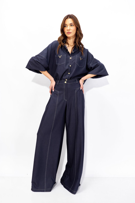 Брюки прямого силуэта расширенные  книзу из костюмной ткани под джинс. По верху притачной пояс со шлевками для ремня. На передних половинках  обработаны карманы, декоративная складка,  застежка молния в среднем шве, на задних – вытачки с карманами. По поясу задних половинок брюк эластичная тесьма (резинка)от вытачки до вытачки. Обращаем ваше внимание, что фурнитура может отличаться от фото.