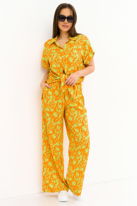 Стильный яркий комплект пижамного типа. Выполнен из нежного комфортного штапеля. Блуза рубашечного кроя с центральной застежкой на пришивные пуговицы.  Воротник отложной, рукав слегка спущен. Брюки свободного  прямого кроя с притачным поясом, дополненным эластичной тесьмой. По бокам расположены  удобные карманы.  Длина блузы от плечевого шва 76см. Длина рукава 20 см. Длина брюк по боковому шву 106см.