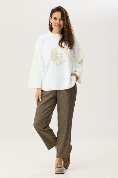 Стильный комплект из вязаного джемпера и брюк. Вязаный джемпер свободного кроя с воротником стойкой. Рукав спущен. Джемпер выполнен из качественной пряжи премиум класса разных фактур. Не скатывается. Приятный к телу. Брюки классического кроя, с притачным поясом, дополненным эластичной тесьмой, с застежкой на пришивную пуговицу и молнию. Посадка средняя. Брюки слегка заужены книзу. Выполнены из мягкой костюмной ткани. Дополнены функциональными боковыми карманами