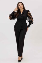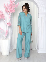 Стильный комплект из платья и полужилета. Платья свободного А-образного силуэта с коротким рукавом. Выполнено из комфортной, держащей форму, ткани. V-образный вырез горловины. По боковым швам полатье дополнено функциональными карманами. Платье дополнено съемным полужилетом. Выполнен из такой же ткани, что и платье, но дополнен пришивными линиями из пайеток. Жилет на одно плечо с застежкой по талии на пришивной пояс с пряжкой. Жилет на подкладке. Длина платья от плечевого шва 132см. Длина рукава 15см. Длина жилета от плечевого шва 67см.