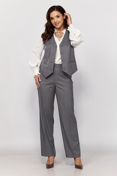 Жилет полуприлегающего силуэта на полной подкладке и застежкой на пуговицы. По переду прорезной карман, сзади - хлястик с застежкой на 2 пуговицы.