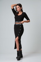 Модный и актуальный женский комплект из двух предметов. Брюки-кюлоты с элегантным запахом, свободной посадки, брючины широкие укороченные, чуть выше щиколотки. По переду молния, сзади по поясу вставлена резинка, запах фиксируется поясом на пряжки. Футболка из мягкого и приятного к телу трикотажа. Футболка свободного кроя, рукав укороченный, по переду в качестве декора — яркий принт. Оба изделия прекрасно сочетаются между собой и могут смело создавать дополнительные стильные комбинации с другими вещами. В данном комплекте будет комфортно в жаркие летние дни. Длина футболки по спинке 62 +/-1 см, длина рукава 30 +/-1 см. Длина брюк по боковому шву 94 см, шаговому — 60 см. Изделие подойдет на рост 170 см.