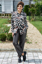 Универсальный и удобный женский брючный костюм для любого повода ,из мягкого материала с эффектом легкой мятости ,что предает шарм изделию . Жакет свободный укороченный с цельнокроенным рукавом длиной до локтя, по низу с отворачивающимся манжетом. Перед жакета с ассиметричной косой застежкой на навесные петли с пуговицами. Брюки-шаровары длиной 7/8, по верху с поясом на резинке. Имеются боковые карманы в швах. Также по талии (переда) двухвстречные складки, по низу передних и задних половинок односторонние складки, придающие пышность брюкам. Комплект смело сочетается с любой обувью. Длина жакета по спинке 57 см, длина рукава от горловины 33 см. Длина брюк по боковому шву 95 см, по шаговому 64 см. Изделие подойдет на рост 170 см.