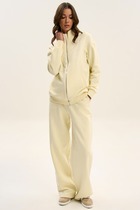 Повседневный брючный костюм из двух предметов — жакет и брюки. Жакет из буклированного однотона, брюки — однотонный вискозный трикотаж. Жакет укороченный с капюшоном и объемными рукавами, по переду застегивается на асимметричную застежку — молнию, имеются карманы. Спинка цельная. Края жакета, рукава, борта и капюшона с открытыми срезами и отделочной строчкой. Брюки-бананы свободного кроя, длина 7/8, пояс притачной на резинке, в боковых швах карманы. Низ брюк — цельнокроеная манжета с отворотом на лицо. Брюки украшены нашивкой. Оба изделия смело можно сочетать с другими вещами вашего гардероба. Длина изделия по спинке 57см(+-1 см), длина рукава от горловины 61 см/(+-1 см); длина брюк по боковому шву 97см(+-1 см), по шаговому 65см(+-1 см). Изделие подойдет на рост 170см.