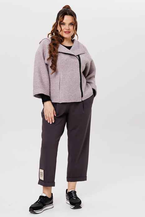 Повседневный брючный костюм из двух предметов — жакет и брюки. Жакет из буклированного однотона, брюки — однотонный вискозный трикотаж. Жакет укороченный с капюшоном и объемными рукавами, по переду застегивается на асимметричную застежку — молнию, имеются карманы. Спинка цельная. Края жакета, рукава, борта и капюшона с открытыми срезами и отделочной строчкой. Брюки-бананы свободного кроя, длина 7/8, пояс притачной на резинке, в боковых швах карманы. Низ брюк — цельнокроеная манжета с отворотом на лицо. Брюки украшены нашивкой. Оба изделия смело можно сочетать с другими вещами вашего гардероба. Длина изделия по спинке 57см(+-1 см), длина рукава от горловины 61 см/(+-1 см); длина брюк по боковому шву 97см(+-1 см), по шаговому 65см(+-1 см). Изделие подойдет на рост 170см.